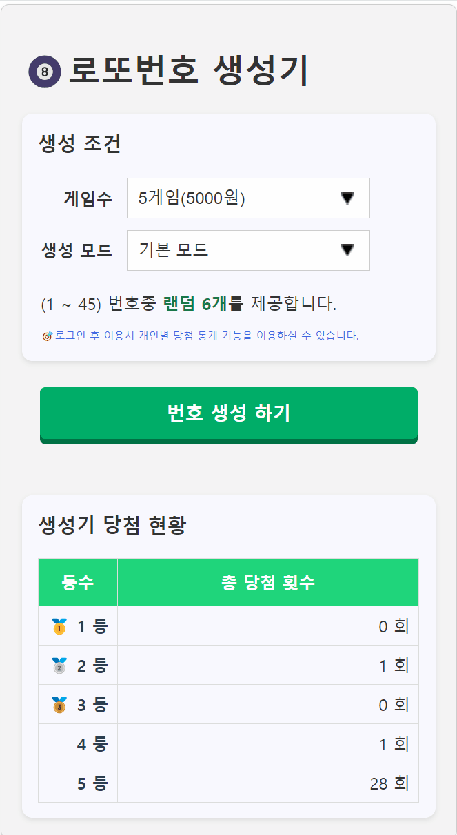 이러한 통계기능인데, 추출기로 생성한 번호를 실제 당첨 번호와 비교해서 추출기의 당첨확률이 얼마나 되는지 통계를 만들어주는 기능이다.