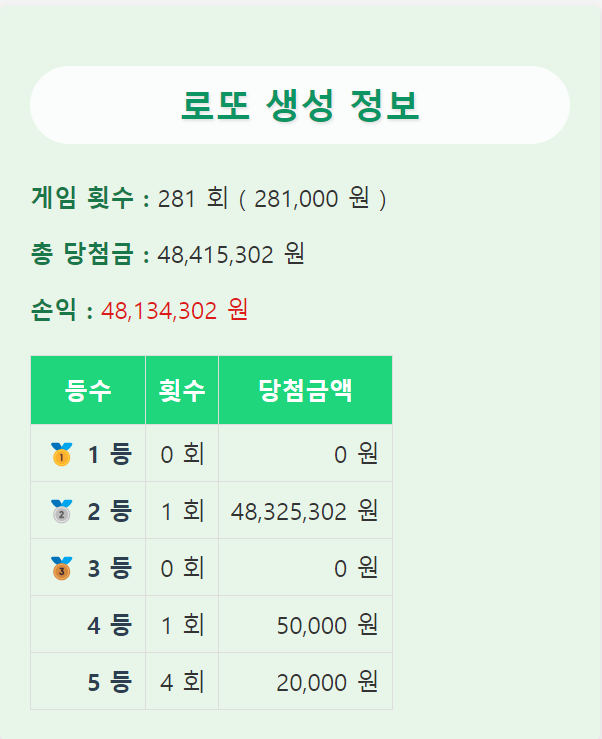 이 기능을 만들다 테스트로 만든 계정에서 2등 번호가 나왔다. 이 번호를 샀어야 했는데...