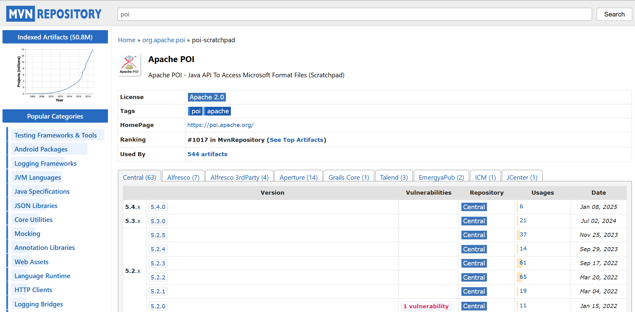 버전 조회를 위해 `Maven Repository`에 접속한 뒤 poi를 검색했다.