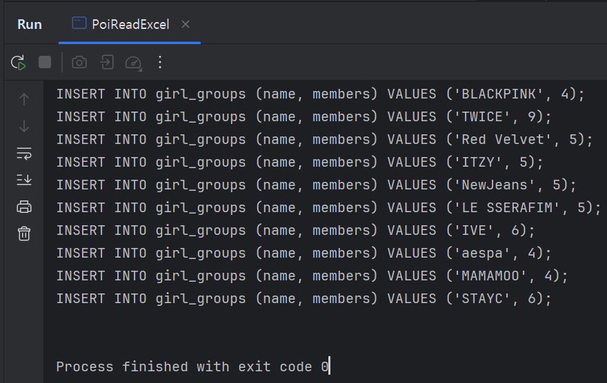 이번에는 방금 생성한 엑셀 파일을 읽어낸 뒤에 그 값을 이용해 insert 쿼리를 만들어 보겠다.