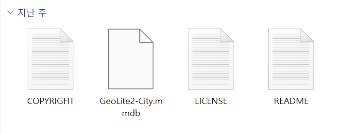 압축을 풀면 다양한 텍스트 파일과 GeoLite2-City.mmdb 파일을 찾을 수 있다.