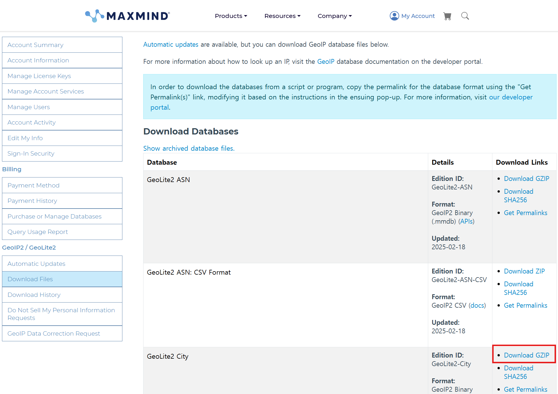 2. MaxMind 접속 후 mmdb 파일 다운로드