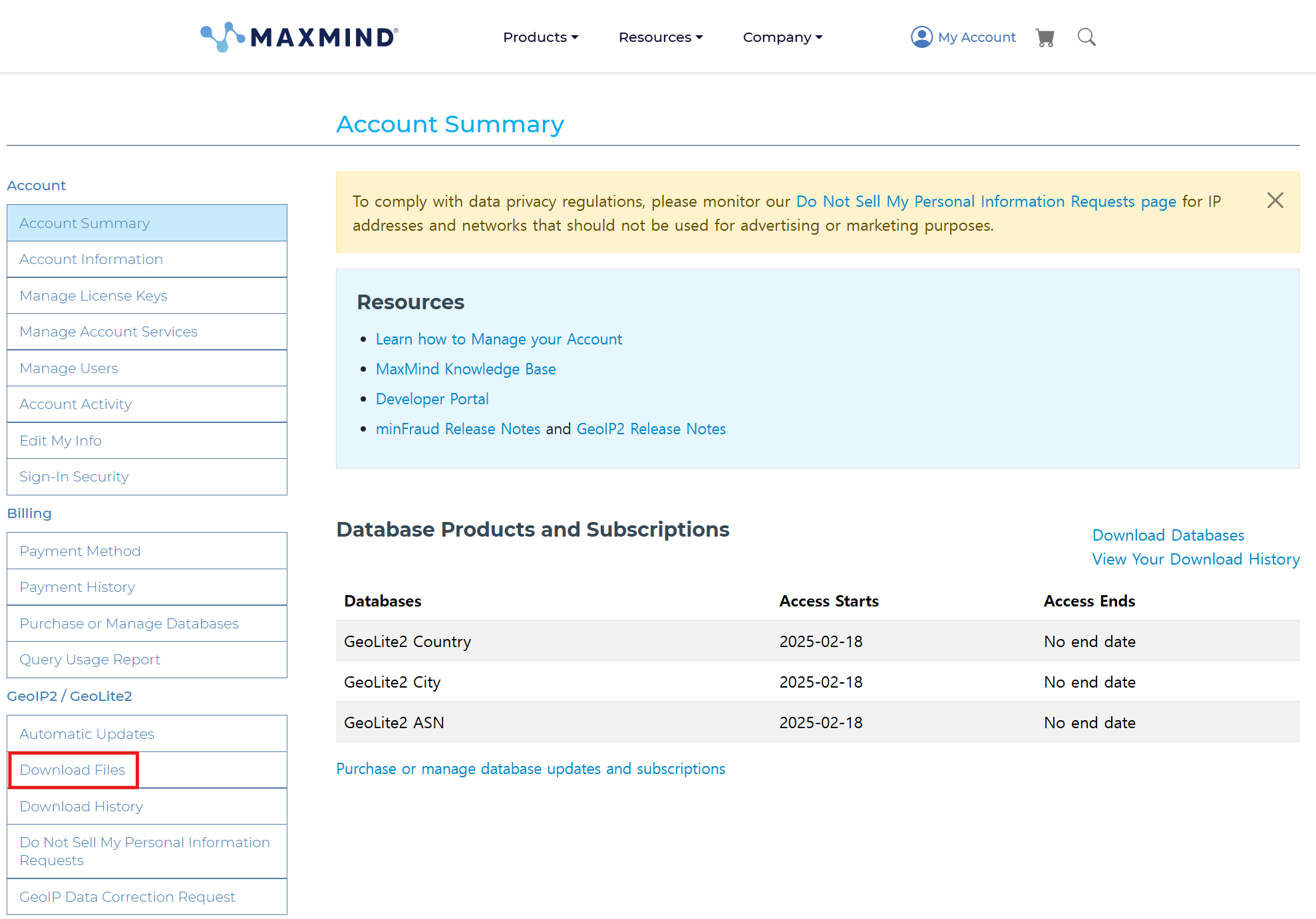 가입 후 로그인하게 되면 위 스크린샷의 화면이 보이게 되는데 왼쪽메뉴의 GeoIP2 / GeoLite2 하단의 Download Files 메뉴를 클릭하자.