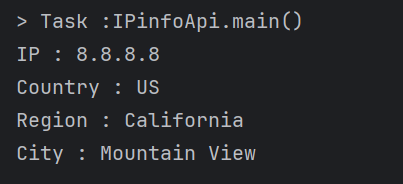 String apiUrl = "https://ipinfo.io/" + testIp + "/json";